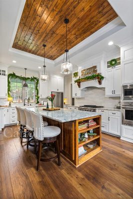 - Stained V Groove Nordic Spruce ceiling for the exterior front and rear porch, kitchen and master bedroom