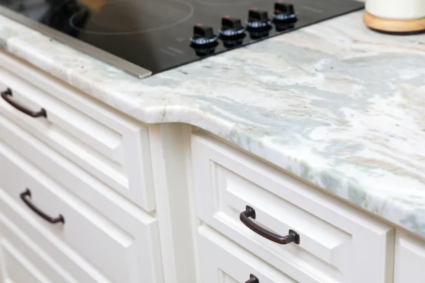 - Specialty features with the cabinets included an open book shelf for the island, trash and tray pull outs, and square recessed panel MDF cabinet doors with oil rubbed bronze hardware.