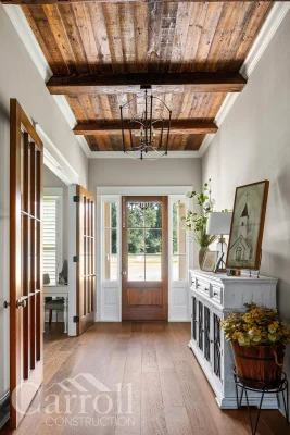 In the kitchen, we eliminated most upper cabinets in favor of open shelving, which made the room feel more open. For durability, we used engineered hardwood flooring throughout the main living areas. At the same time, we brought in character with reclaimed pine ceiling beams and decorative plank accents that gave the house warmth.