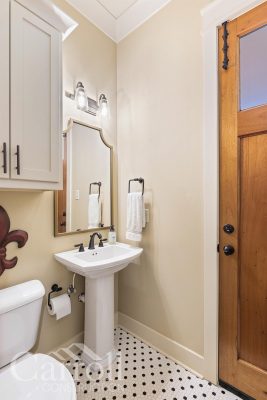 - Tile Floors: 12x24 Belgian Linen Natural – Bathrooms, 2” Hex Mosaic Soho White with Black Dot – Powder and Laundry