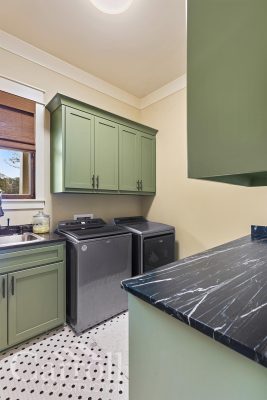 – Built-in medicine cabinets and octagon-dot tile in the laundry for a timeless touch