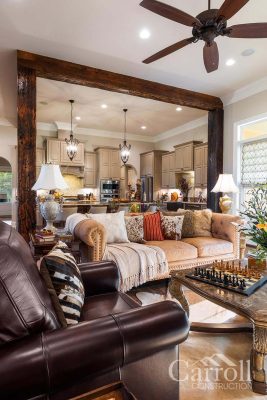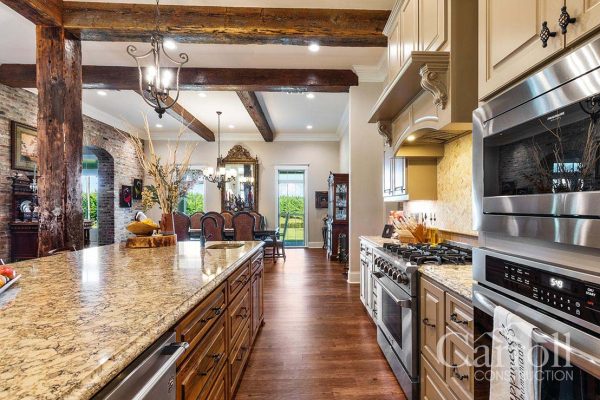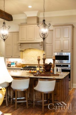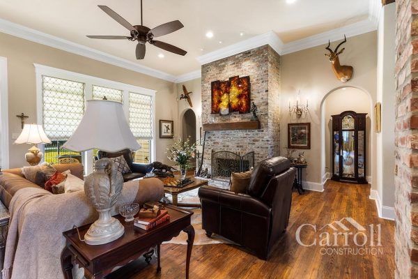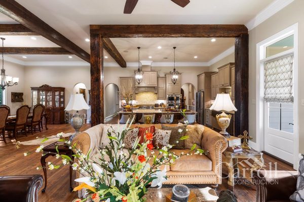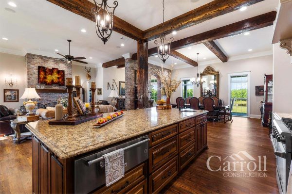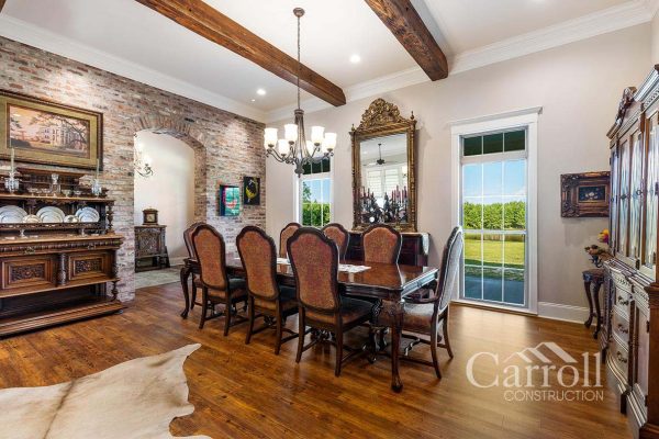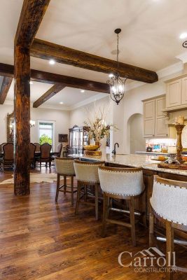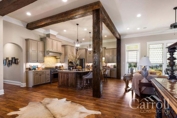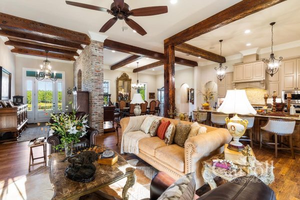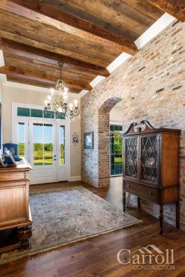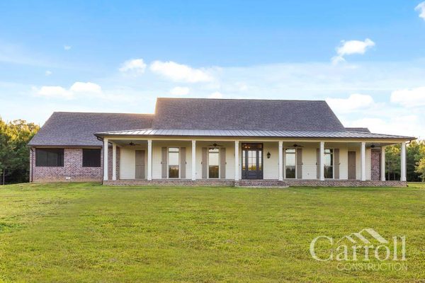 This Acadian French style farmhouse features clean lines and bold accents, high ceilings, striking and prominent beams, and large front porch with beaded board ceilings was a delight to build. The living room, kitchen, and foyer have an open floor plan great for entertaining.