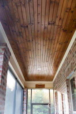 - Reclaimed Pine Beams and Siding material utilized for ceiling cladding.